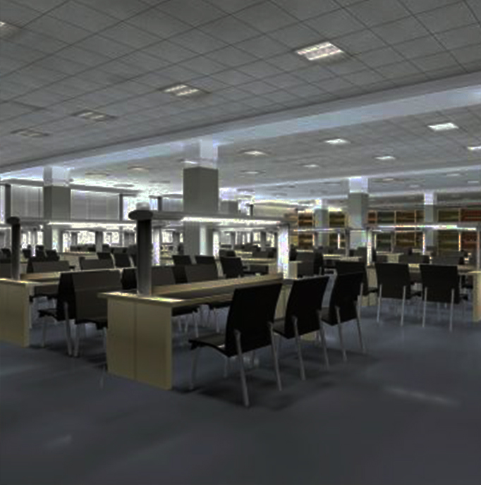 控制藏書區和閱覽區。藏書區采用多功能傳感器控制和定時控制。當藏書區開放時自動開啟1/3隔燈照明,保證基本照度。有人進入時多功能傳感器自動開啟該區域的燈光,方便取閱。取閱者離開后延時關閉該區域燈光以節約電能。藏書區停止使用時延時關燈;閱覽室則采用照度控制和定時控制。照度傳感器根據室外光照自動控制窗邊燈光和電動窗簾,保證合適的閱讀照度,同時節約能源。閱覽室停止使用時延時關燈。