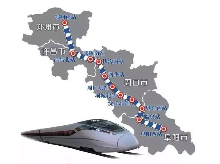 鄭阜鐵路北起鄭州南站,經河南鄭州、開封、許昌、周口,進入安徽省阜陽,接入商合杭鐵路阜陽西站,線路全長267公里,工程總投資約427.2億元,其中安徽段長65公里,投資140億元,設計行車時速350公里。全線設鄭州南、許昌北、鄢陵南、扶溝南、西華、周口東、淮陽、沈丘北、界首南、臨泉、阜陽西等11座車站。鄭阜高鐵計劃今年8月開始聯調聯試,年內建成通車,并與商合杭鐵路銜接,延伸到杭州。屆時鄭州到阜陽僅需1個多小時,鄭州到合肥僅需兩個多小時,到杭州也僅需3個多小時。