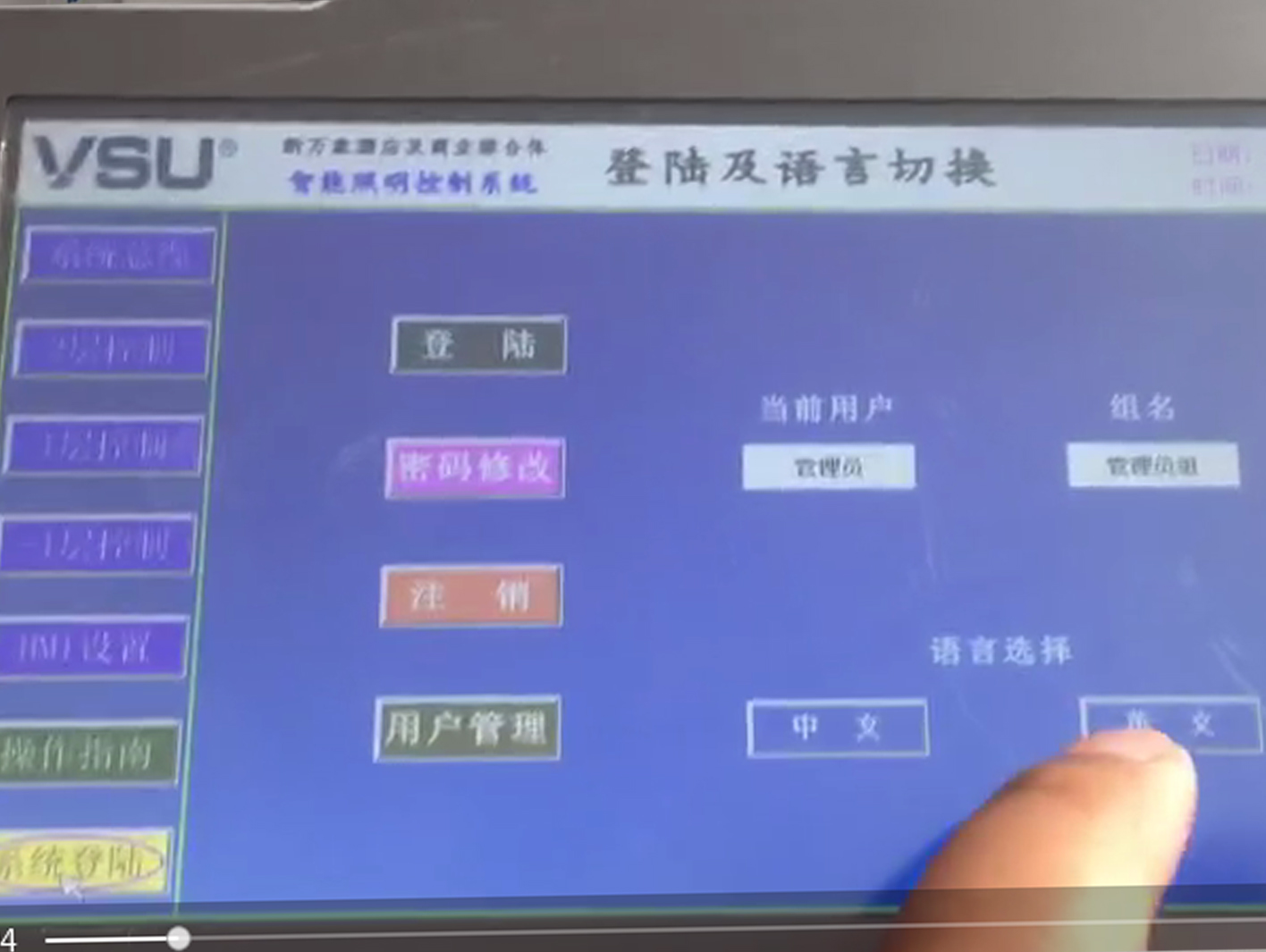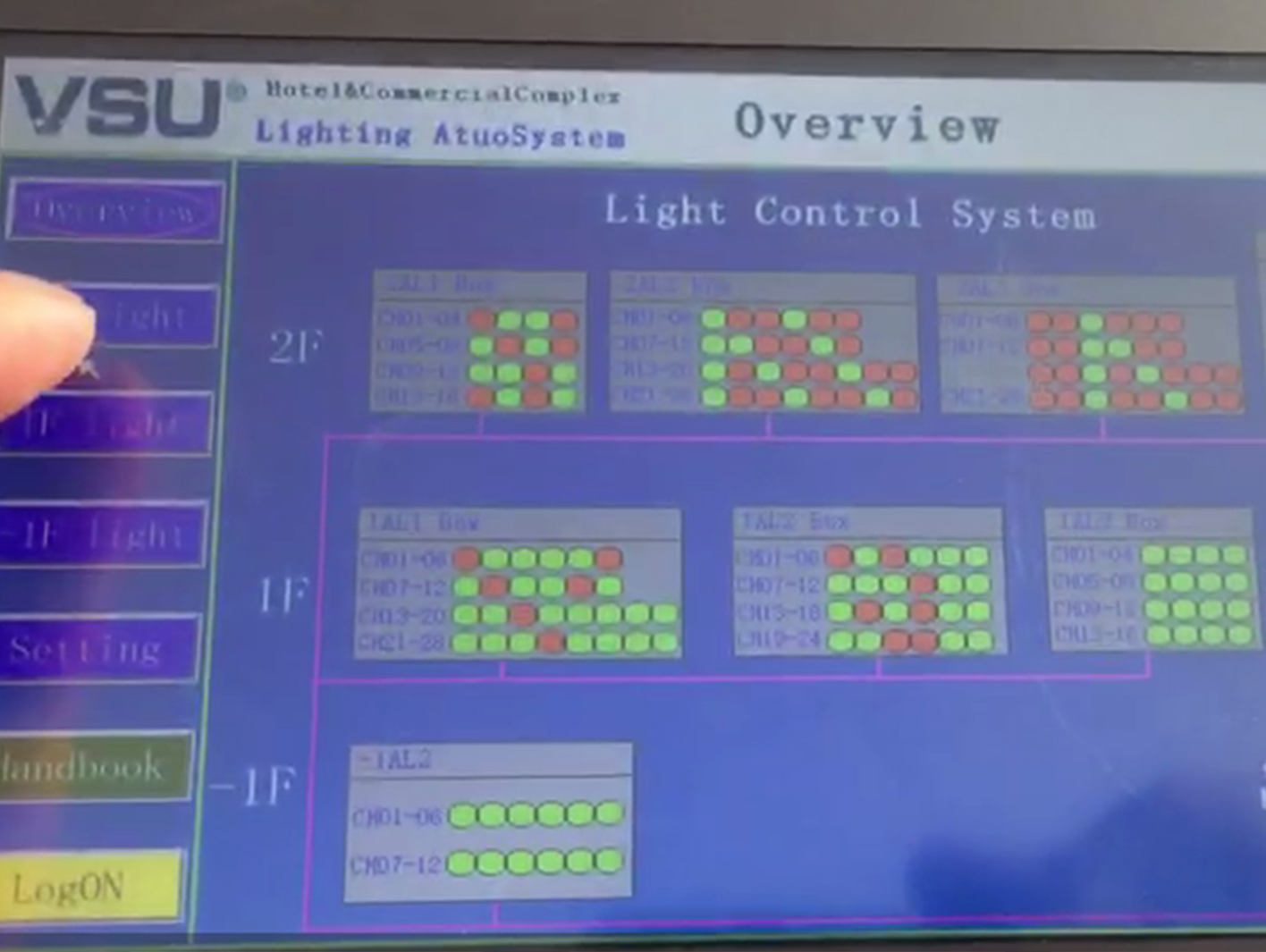 上圖為項目現(xiàn)場內(nèi)的電箱圖片,產(chǎn)品采用導(dǎo)軌式安裝,安裝簡單,普通電工即可完成。通過現(xiàn)場的觸摸屏可對控制終端任意操作,語言選擇中文/English,燈具單控全控,遠(yuǎn)程操控。并且可以將建筑內(nèi)的燈具開關(guān)狀態(tài)了如指掌,避免疏忽管理,導(dǎo)致電能耗上升情況的發(fā)生。