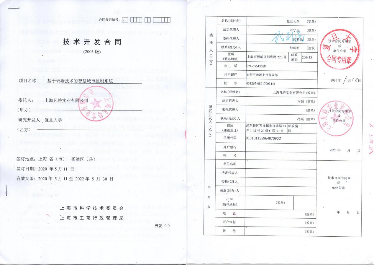 同年 5月11日,上海凡特實業有限公司正式與復旦大學簽訂《技術開發合同》——基于云端技術的智慧城市控制系統。項目將圍繞智慧城市開展科學研究、技術開發、成果轉化及文化交流等方面的合作。這次合作一面是能夠落實國家科教興國戰略,促進科技創新,加快企業經濟發展,充分利用高等院校的技術、人力等資源以及先進成熟的技術成果。另一面,利用企業的生產條件,提高教學的科研能力,將科研成果盡快地轉化為生產力,不斷提升企業的技術和管理水平,雙方發展各自優勢。上海凡特通過多種形式開展全面合作,共同推進公司與復旦學校的全面技術合作,形成專業、產業相互促進、共同發展,努力實現“校企合作、產學雙贏”!