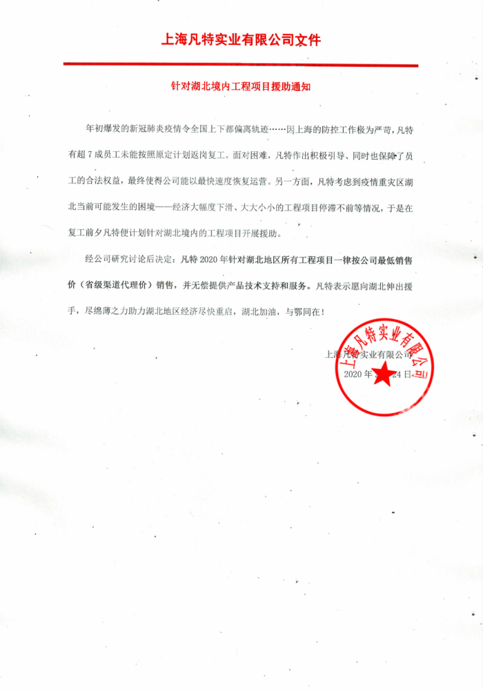 經公司研究討論后決定:凡特2020年針對湖北地區所有工程項目一律按公司最低銷售價(省級渠道代理價)銷售,并無償提供產品技術支持和服務。凡特表示愿向湖北伸出援手,盡綿薄之力助力湖北地區經濟盡快重啟,湖北加油,與鄂同在!