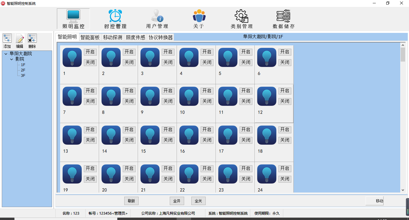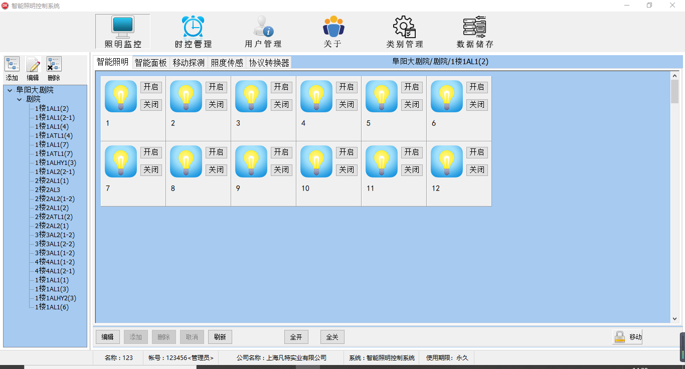 智能照明控制系統可在管理中心通過電腦遠程控制整個劇場的燈光,實現一鍵全開、全關,亦可控制每個回路的開關,預設上下班時間自動開啟關閉整個場地的燈光避免漏關錯關等現象不同場館功能廳都有其專屬的控制方式。例如:阜陽圖書館的藏書區域出入頻繁,但不必常亮的區域,采用紅外感應控制,可實現人到燈亮,人走燈延時熄滅的效果,既能最大限度節約能源,又能保證照明需求;閱覽室則通過照度控制和定時控制,光照傳感器根據室外環境光照調光,保證合適的閱讀照度,同時節約能源。阜陽大劇院多功能廳表演區域主要采用調光控制、場景控制,通過實現場景的預設置和記憶功能,只需操作控制面板即可開啟一個燈光場景,各照明回路隨即能自動變換到相應的狀態,通過調光在不同表演需求產生不同的燈光效果,營造最舒適的觀感效果。