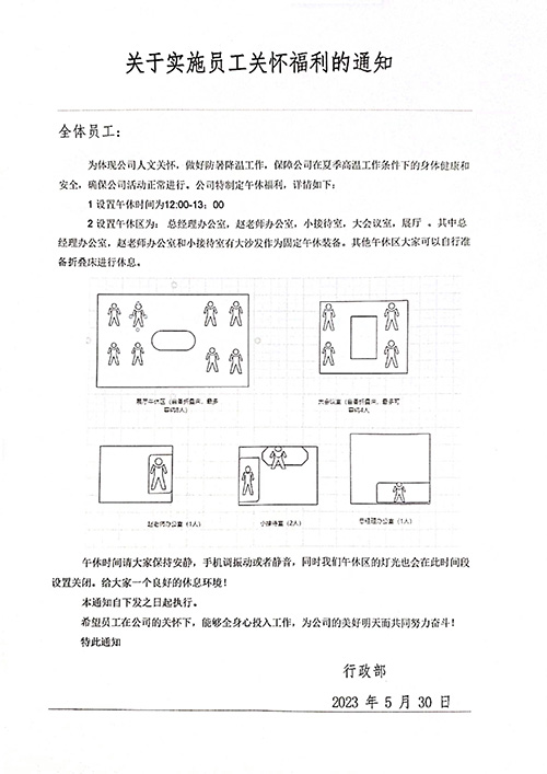 公司設置了午休區并購置了"午休神器",神器寬大柔軟,如折疊睡墊;配備的緩解頸部勞累的充氣枕,釋放了上午工作的疲勞。讓員工在午休時間休息好,養足精神,不是一件小事。該通知讓員工感受到了企業大家庭的溫暖,也是企業人文關懷的真情體現,獲得大家的一致好評點贊,也使得下午的工作更加投入用心。