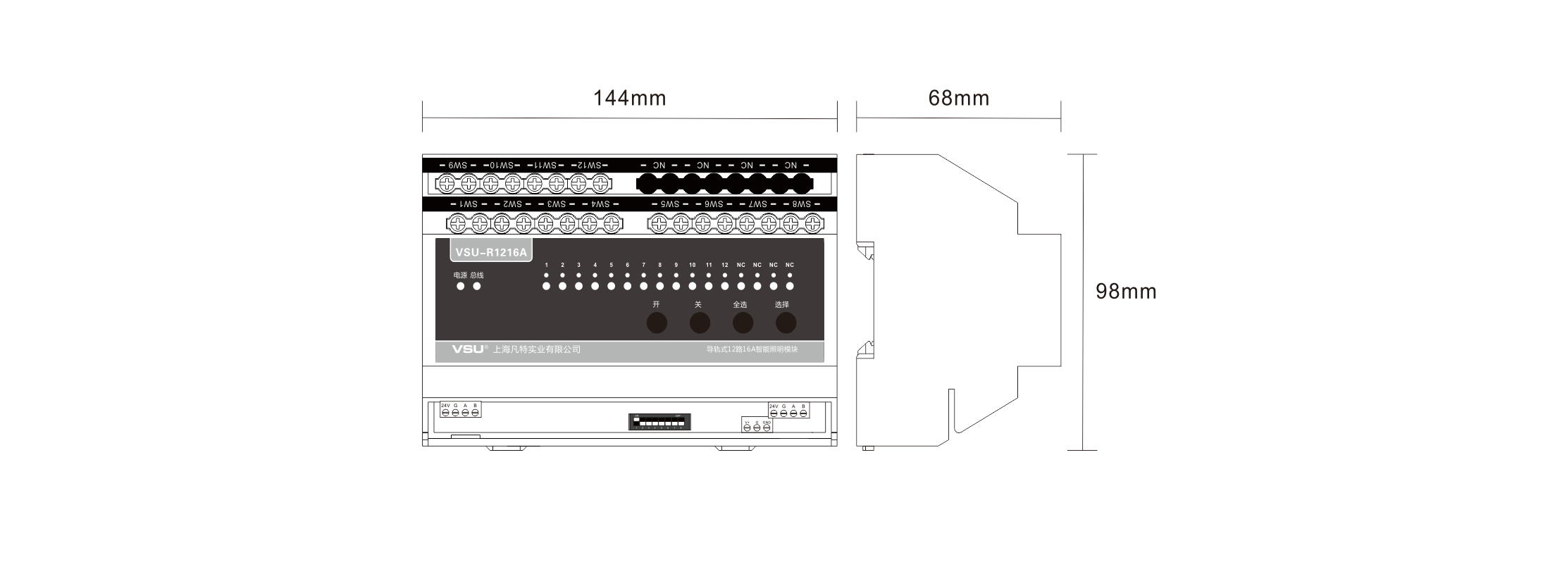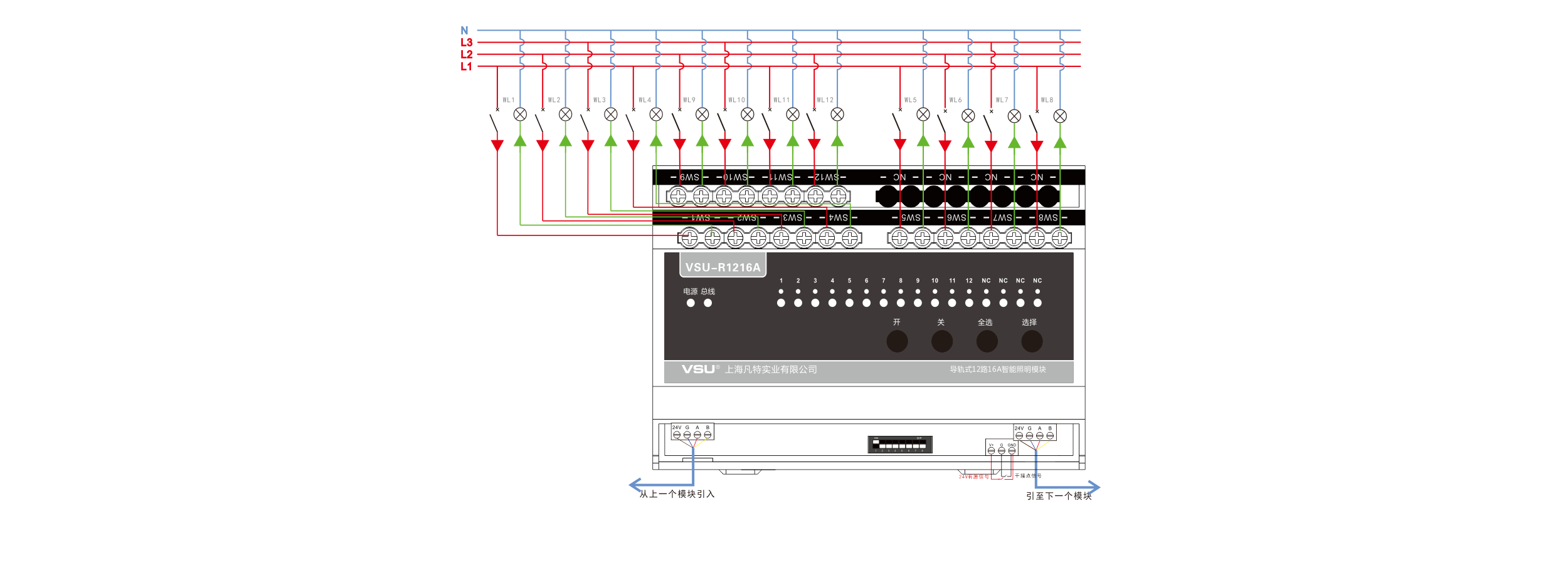 本產品為導軌式安裝,含12路智能繼電器,每回路可獨立控制3520W燈具的開關,帶應急按鍵,LED燈實時指示各個回路開關狀態,可設置為互鎖控制6組窗簾開合; |