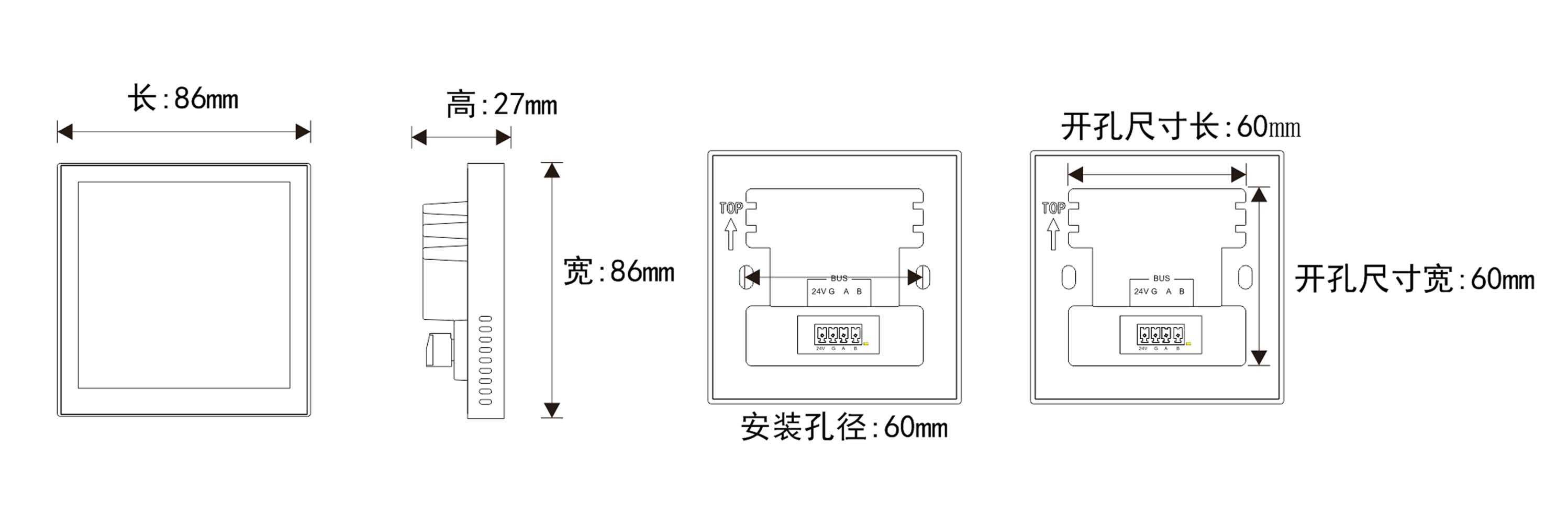 標準86盒安裝,4寸真彩屏,單控開關、窗簾和場景總線控制,可自定義界面支持3D文字、3D圖片,個性化界面;用于集中控制,支持雙向通信,安裝方便,接口靈活,適用于各種多媒體中央控制系統。