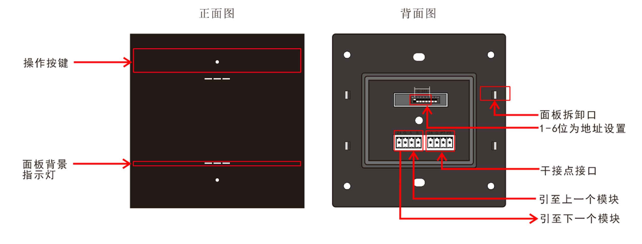標準86底盒安裝,支持無縫聯接,提供2鍵,每個按鍵帶1路LED指示燈,復位式輕觸開關,結構成熟,性能穩定,標準工藝,采用塑料材質(顏色可選灰色、黑色和香檳金);自帶感應式背光燈;提供兩路IO輸入可外接傳感器。