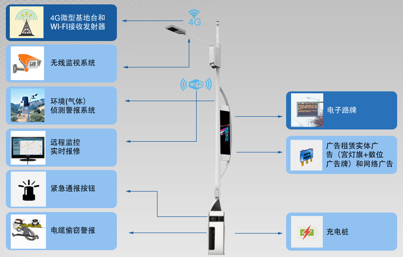 智慧路燈桿是一種集成各種信息設備技術創新復合應用的智慧路燈產品,整個智慧燈桿內包含路燈照明控制系統、WIFI天線基站、視頻監控管理、廣告屏播控系統、城市環境實時監測、緊急呼叫系統、水位監測、充電樁系統和井蓋監測系統等應用。