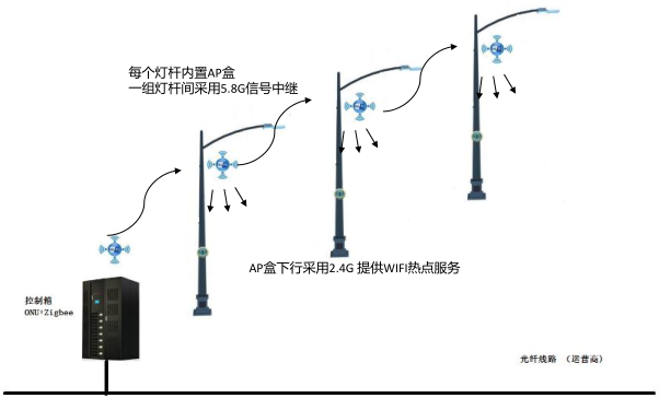 采用運營商光纖網絡比無線4G更加穩定,在不具備部署光纖的區域,可以使用4G微基站。采用5.8G信號在燈桿間做Mesh,同時提供下行2.4G頻段作為AP上網使用。