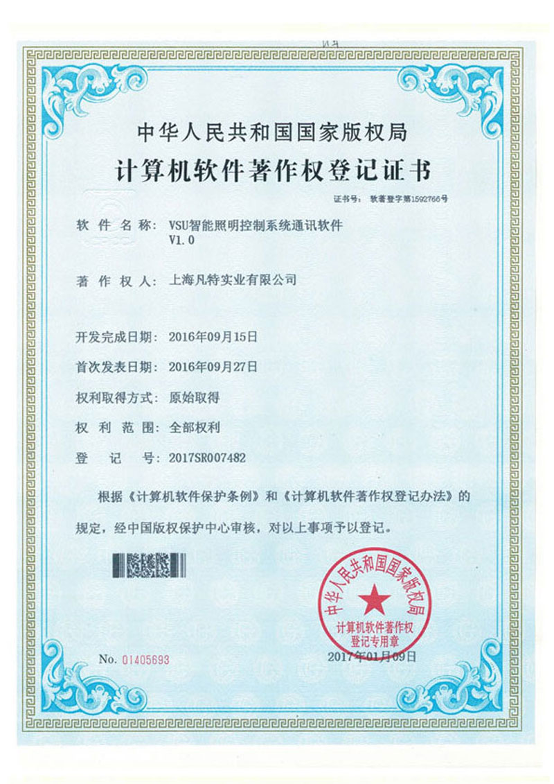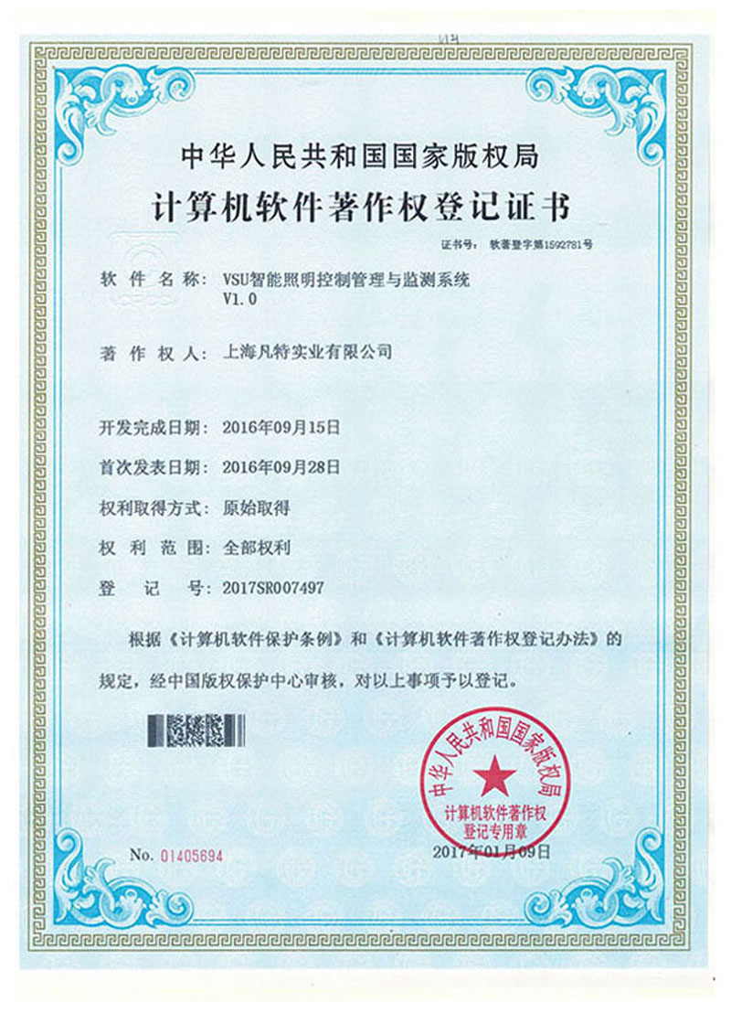 VSU智能照明有多項自主知識產品證書,所有產品都經過國際CE認證,符合國際電工標準。