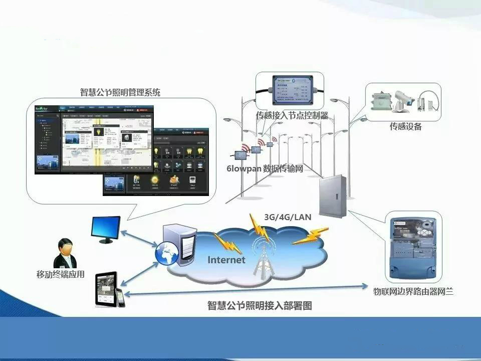 智慧照明又可以叫智慧公共照明管理平臺(tái)、智能路燈或智慧路燈,是根據(jù)運(yùn)用專業(yè)、高效、可靠的電力線載波通訊技術(shù)和無線GPRS/CDMA通訊技術(shù)等,實(shí)現(xiàn)對(duì)路燈的遠(yuǎn)程集中控制系統(tǒng)與管理方法,具備根據(jù)···